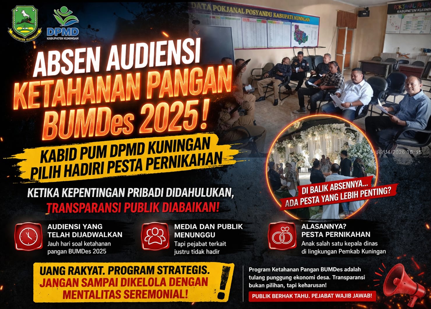 Alih-alih memenuhi agenda yang berkaitan langsung dengan kepentingan publik, pejabat tersebut diketahui menghadiri sekaligus terlibat dalam kepanitiaan pesta pernikahan anak salah satu kepala dinas di lingkungan Pemerintah Kabupaten Kuningan.
