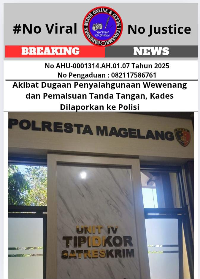 Magelang, kabarSBI/ (GMOCT) 29 Juli 2025 – Ratusan warga Desa Wonogiri, Kecamatan Kajoran, Kabupaten Magelang, menggelar demonstrasi pada Kamis (17/7/2025) menuntut kepala desa mereka mundur dari jabatan. Aksi ini dipicu oleh dugaan penyalahgunaan wewenang dan pemalsuan tanda tangan oleh oknum kepala desa. Kejadian ini berujung pada pelaporan resmi ke Mapolres Magelang pada Senin (26/7/2025).