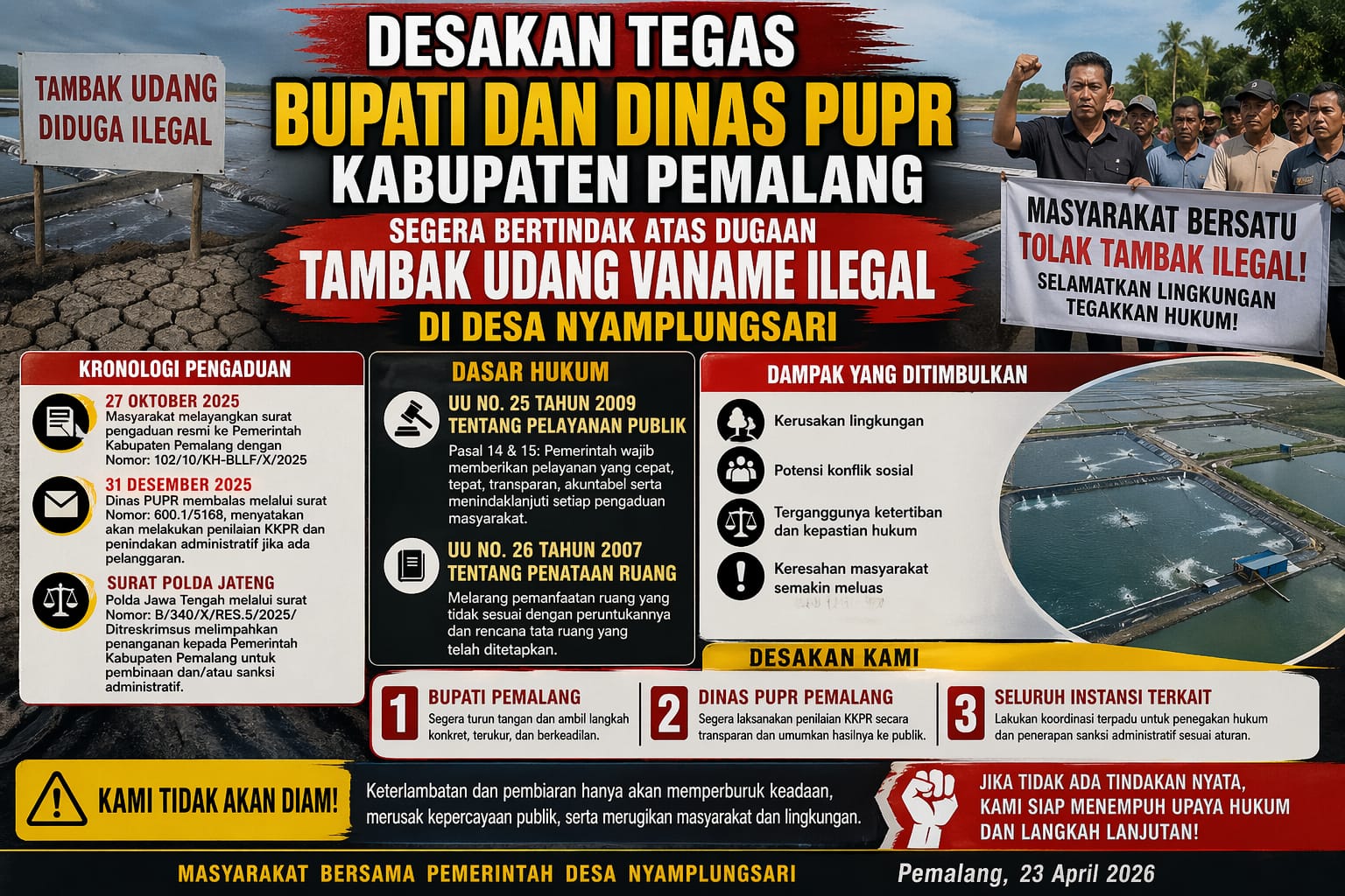 PEMALANG, kabarSBI.com — Masyarakat bersama Pemerintah Desa Nyamplungsari secara tegas menyampaikan kekecewaan dan keprihatinan mendalam atas lambannya respons Pemerintah Kabupaten Pemalang, khususnya Dinas PUPR Kabupaten Pemalang, dalam menindaklanjuti dugaan keberadaan dan aktivitas tambak udang vaname ilegal di wilayah Desa Nyamplungsari, 23 April 2026.