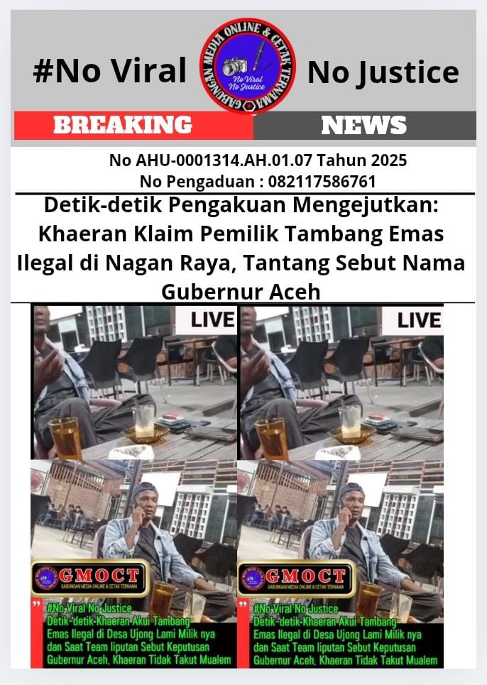 ACEH, kabarSBI.com (GMOCT) – Sebuah video pengakuan yang menghebohkan muncul dari seorang pria bernama Khaeran, yang secara terbuka mengaku sebagai pemilik tambang emas ilegal di Desa Ujong Lami, Kecamatan Darul Makmur, Kabupaten Nagan Raya, Provinsi Aceh. Pengakuan ini terungkap dalam pertemuan antara Khaeran dan tim liputan khusus GMOCT (Gabungan Media Online dan Cetak Ternama) di sebuah kafe di Meulaboh 12 Oktober 2025 sekitar pukul 23.06 WIB.