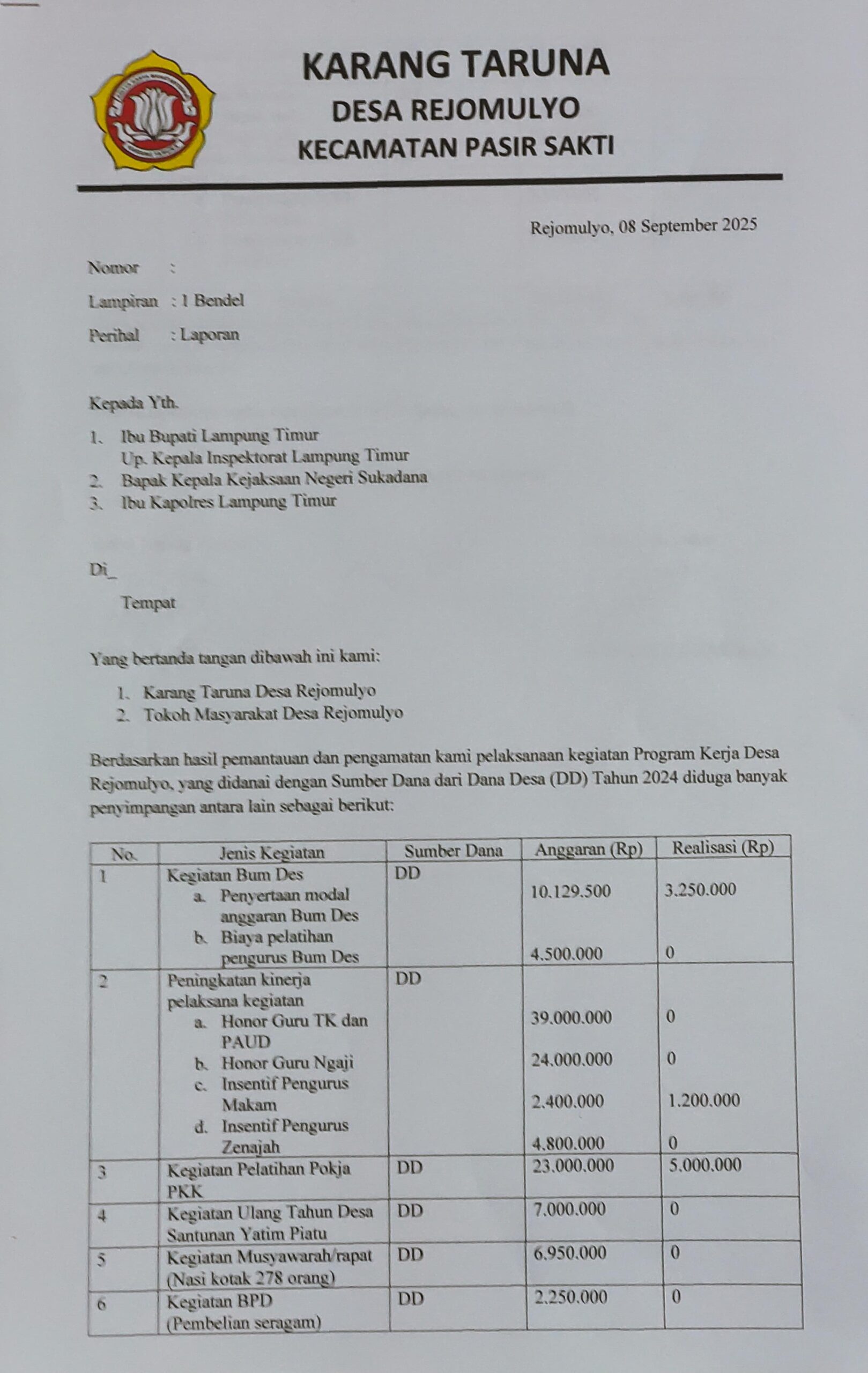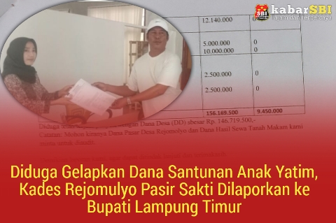 Diduga Gelapkan Dana Santunan Anak Yatim, Kades Rejomulyo Pasir Sakti Dilaporkan ke Bupati Lampung Timur 1LAMPUNG TIMUR, kabarSBI.com — Kepala Desa Rejomulyo, Kecamatan Pasir Sakti, Kabupaten Lampung Timur, dilaporkan ke Bupati Lampung Timur atas dugaan penggelapan dana santunan anak yatim yang bersumber dari Dana Desa (DD) Tahun Anggaran 2024.