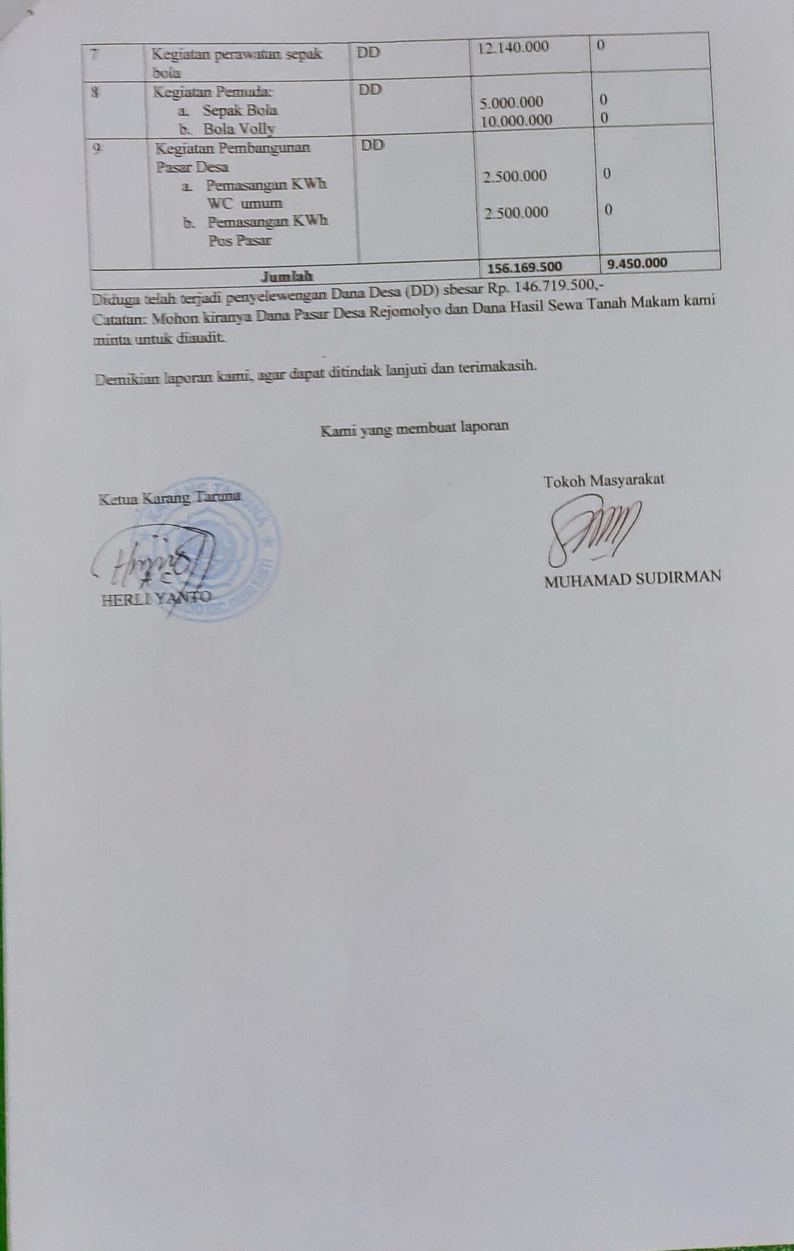Selain itu, pelapor juga meminta agar pengelolaan dana Pasar Desa Rejomulyo serta dana hasil sewa tanah makam desa turut diaudit, mengingat pengelolaannya dinilai tidak transparan dan berpotensi menimbulkan kerugian negara.