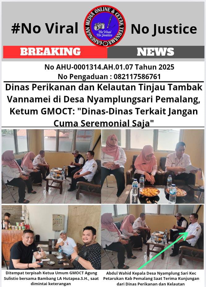 Pemalang, kabarSBI /(GMOCT) – Dinas Perikanan dan Kelautan Provinsi Jawa Tengah, di bawah koordinasi Wahyudi, melakukan kunjungan ke Desa Nyamplungsari Kecamatan Petarukan Kabupaten Pemalang Jawa Tengah pada Rabu, 21 Mei 2025 pukul 13.15 WIB. Kunjungan ini terkait somasi terhadap tambak Vannamei milik Julius yang terletak di sepadan pantai desa tersebut, sebuah kasus yang telah lama diawasi oleh GMOCT, Gabungan Media Online dan Cetak Ternama dan dikawal melalui publikasi.
