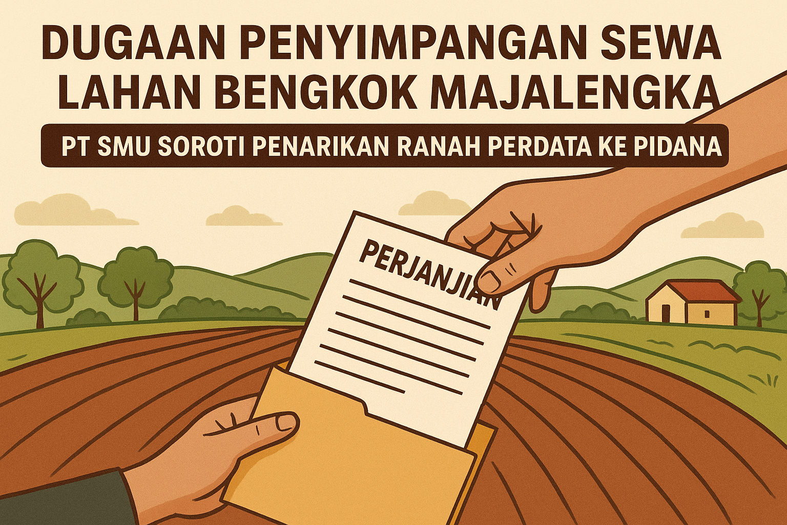 Dugaan Penyimpangan Sewa Lahan Bengkok Majalengka, PT SMU Soroti Penarikan Ranah Perdata ke Pidana 1MAJALENGKA, kabarSBI.com – Proses hukum terkait pemanfaatan lahan eks bengkok milik Pemerintah Kabupaten Majalengka oleh PT Sindangkasih Multi Usaha (Perseroda) memasuki babak baru setelah Kejaksaan Negeri Majalengka menetapkan satu tersangka. PT SMU, sebagai Badan Usaha Milik Daerah (BUMD), menilai perkara tersebut bermula dari perikatan kontrak dan seyogianya menjadi ranah perdata.