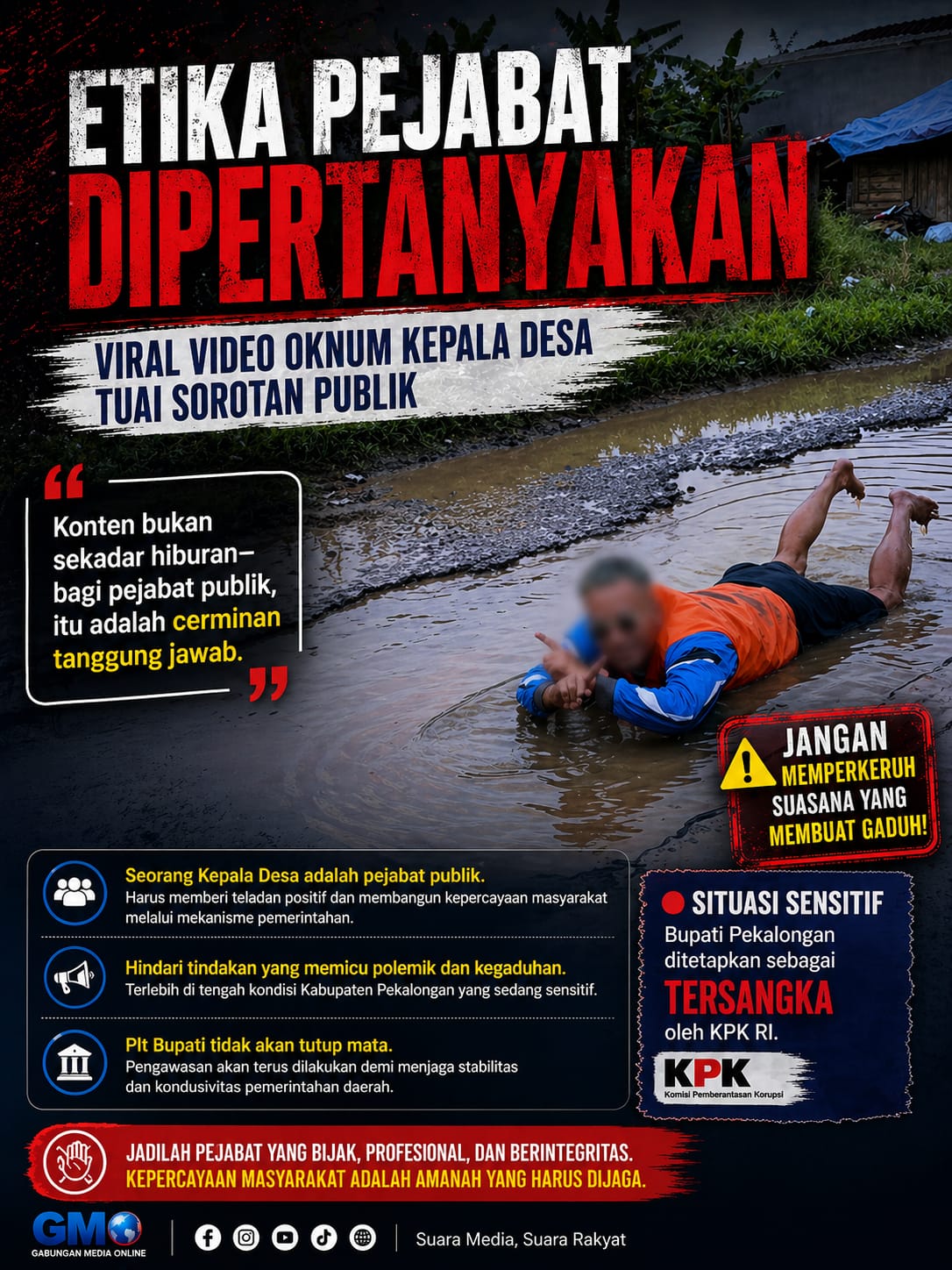 PEKALONGAN, kabarSBI.com – Agung Sulistio selaku Ketua Umum Gabungan Media Online cetak ternama (GMOCT) menyampaikan sorotan tegas terhadap beredarnya video TikTok atas nama Raden Tata yang diduga merupakan seorang oknum Kepala Desa. Konten tersebut dinilai tidak mencerminkan sikap bijak seorang pejabat publik, terlebih dalam situasi sosial dan politik yang sedang sensitif di wilayah Kabupaten Pekalongan, 28 April 2026.
