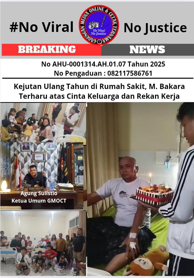 Semarang, kabarSBI – M. Bakara, Kepala Perwakilan Jawa Tengah Media Online Jelajahperkara dan Penajournalis.com, serta anggota GMOCT, menerima kejutan mengharukan di hari ulang tahunnya yang ke-51. Saat dirawat di RS TNI Kota Semarang, ia dikunjungi istri tercinta, anak-anak, dan handai taulan yang membawakan kue ulang tahun. Kejutan tersebut membuat M. Bakara terharu hingga meneteskan air mata. Meskipun dikenal tegas dalam menjalankan tugas jurnalistiknya, momen ini menunjukkan sisi emosionalnya yang lembut.