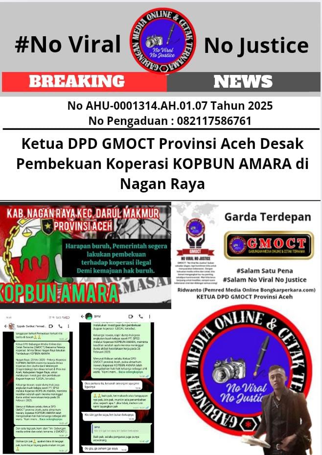 Nagan Raya, kabarSBI/(GMOCT) – Gabungan Media Online dan Cetak Ternama (GMOCT), bersama pekerja Koperasi KOPBUN AMARA, mendesak Dinas Koperasi dan Usaha Kecil Menengah (Disprindakop) Kabupaten Nagan Raya untuk segera melakukan investigasi dan pembekuan koperasi tersebut. Desakan ini muncul menyusul meninggalnya Irawan, seorang sopir dump truk yang bekerja melalui KOPBUN AMARA, akibat kecelakaan kerja pada 26 Februari 2025 lalu.