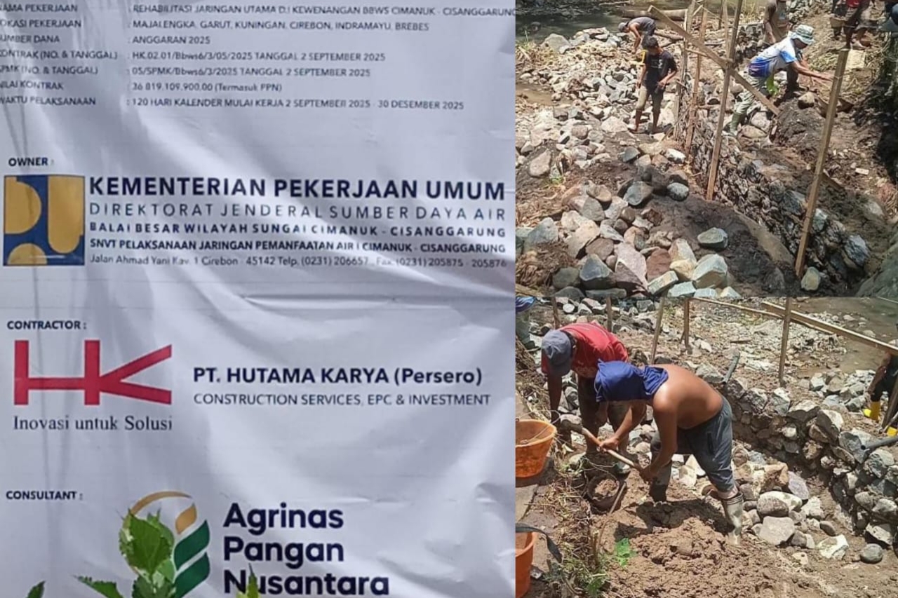 Tak berhenti di sana. Pekerja di lokasi mengakui material batu diambil langsung dari sungai sekitar lokasi pekerjaan tanpa izin resmi. Batu-batu tersebut digunakan untuk membangun turap yang masuk dalam paket rehabilitasi jaringan utama di wilayah Majalengka, Garut, Kuningan, Cirebon, Indramayu hingga Brebes. Mandor lapangan, Didi, menyebut penggunaan pasir ladon dan batu lokal dilakukan atas instruksi kontraktor dengan dalih sulitnya menemukan pasir sesuai spek. Ia juga mengungkap tidak adanya RAB yang dijalankan secara ketat: “Kerjakan saja dulu, baru dihitung biayanya,” ujarnya.