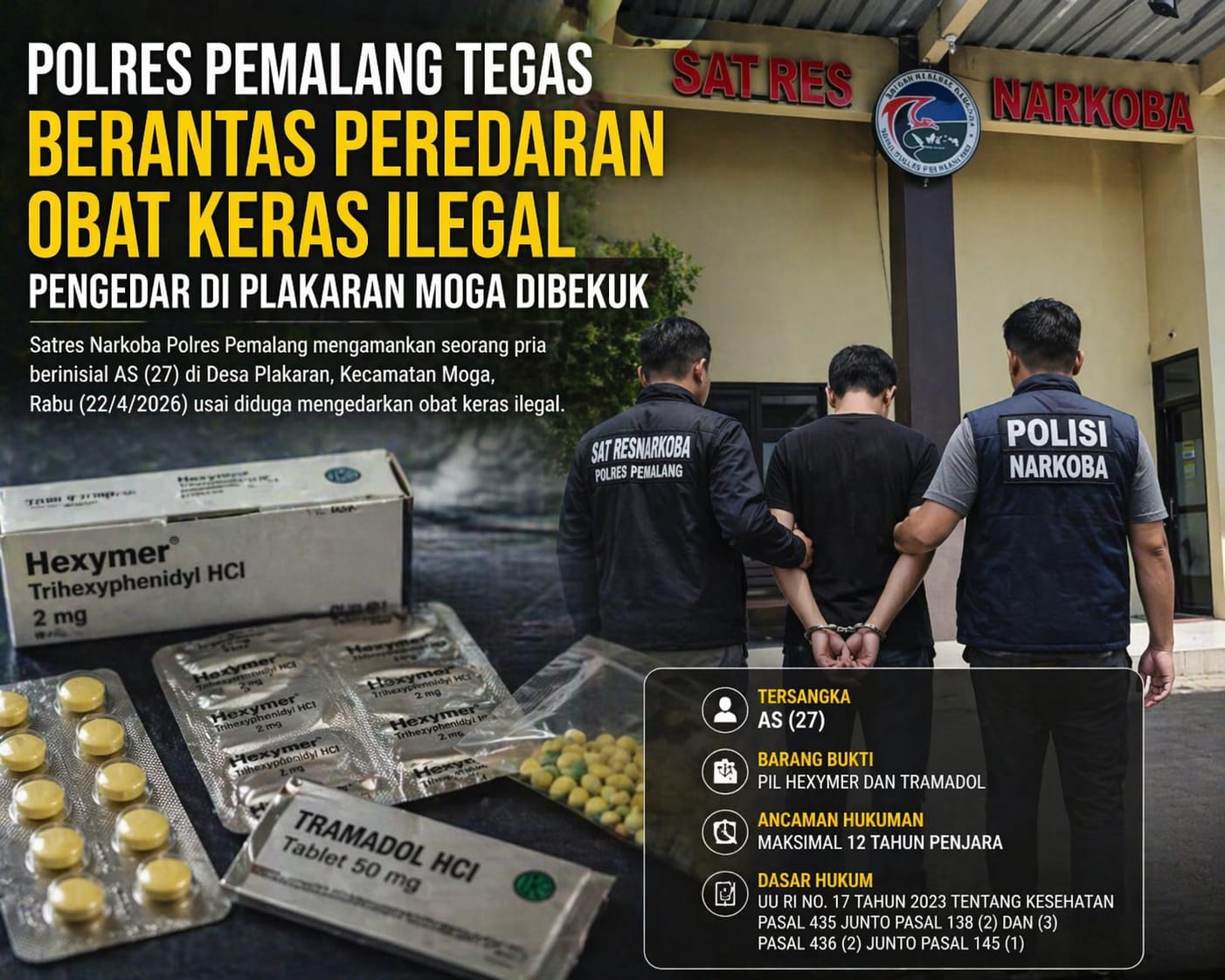 PEMALANG, kabarSBI.com — Komitmen aparat dalam memberantas peredaran obat keras ilegal kembali ditunjukkan oleh jajaran Satuan Reserse Narkoba Polres Pemalang. Seorang pria berinisial AS (27) berhasil diamankan di Desa Plakaran, Kecamatan Moga, setelah diduga kuat terlibat dalam aktivitas peredaran obat terlarang yang meresahkan masyarakat, 23 April 2026.