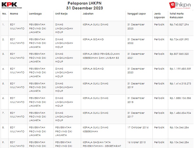 JAKARTA, kabarSBI.com – ‘DILAPORKAN’, Komisi Pemberantasa Korupsi (KPK) melalui e-lhkpn, melaporkan pada publik harta kekayaan Pejabat Pemprov DKI Jakarta, Kepala Suku Dinas Lingkungan Hidup Kota Adm Jakarta Utara, Edy Mulyanto, tercatat pada tanggal 31 Desember 2023, sub total harta sebesar Rp 2.380.141.950. Sedangkan untuk Tahun 2024 belum tercatat laporan e-lhkpn.